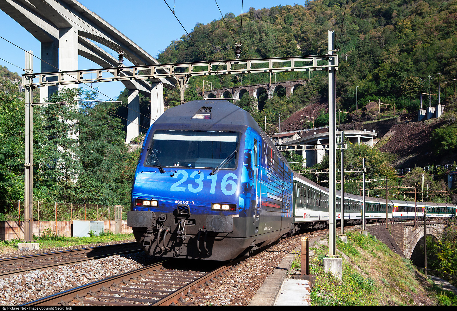 | Re 460 # 021 of the SBB, in the special paint scheme "2316", pulls the Interregio 2163 from Lucerne over the Gotthard mountain line to Locarno, in the Biaschina between Lavorgo and Giornico. The slogan on the locomotive says: 2316 train drivers take you the equivalent of 2625 times around the world each year. The idea for this special paint scheme (adhesives) came from the engineer Kurt Gloor of Spiez, who won a competition for the design of a special "driver locomotive". Re 460 # 021 had this paint scheme from september 2008 to september 2012. |