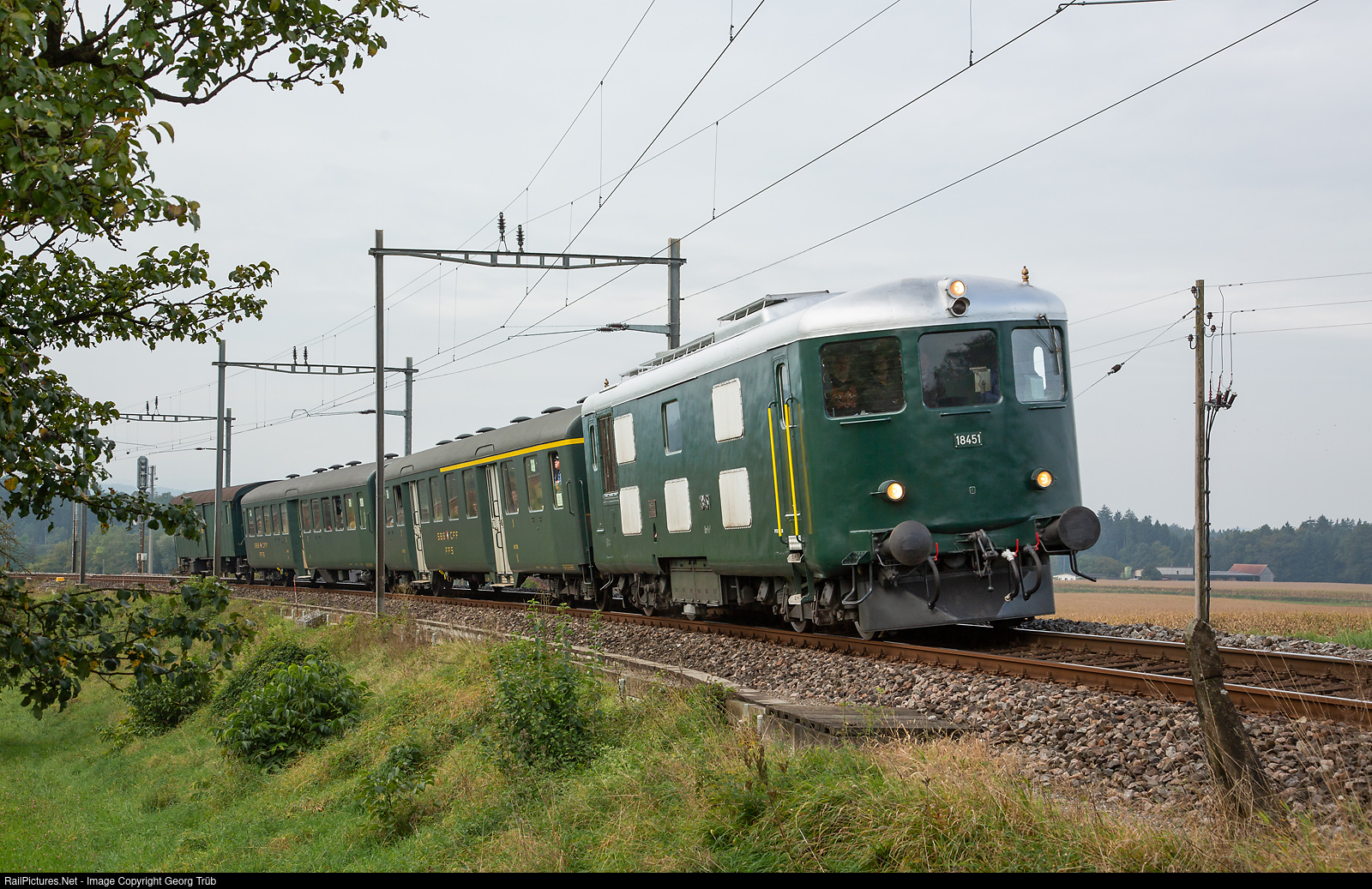 Diesel locomotive Bm 4/4 II # 18451 of SBB Historic from 1939 with a photo train from Winterthur to Ramsen, near Ossingen. The locomotive was built, together with a sister locomotive, as Am 4/4 # 1001 and # 1002 by SLM, Brown Boveri Company and Sulzer for the SBB. The four-stroke, eight-cylinder Sulzer diesel engine with 880 kW power brought the very lightly-built locomotive (only 16 tons axle load) to a maximum speed of 110 km / h. In 1963, the two locomotives got new gearboxes, the top speed was reduced to 75 km/h, the tractive power increased. They were then labelled Bm 4/4 II # 18451 and # 18452. Locomotive # 18452 was scrapped in 1990, # 18451 is historic locomotive in Olten and its original Sulzer diesel engine from 1939 received a fully overhaul a few years ago. In the moment, the locomotive has some problems and is not operational.