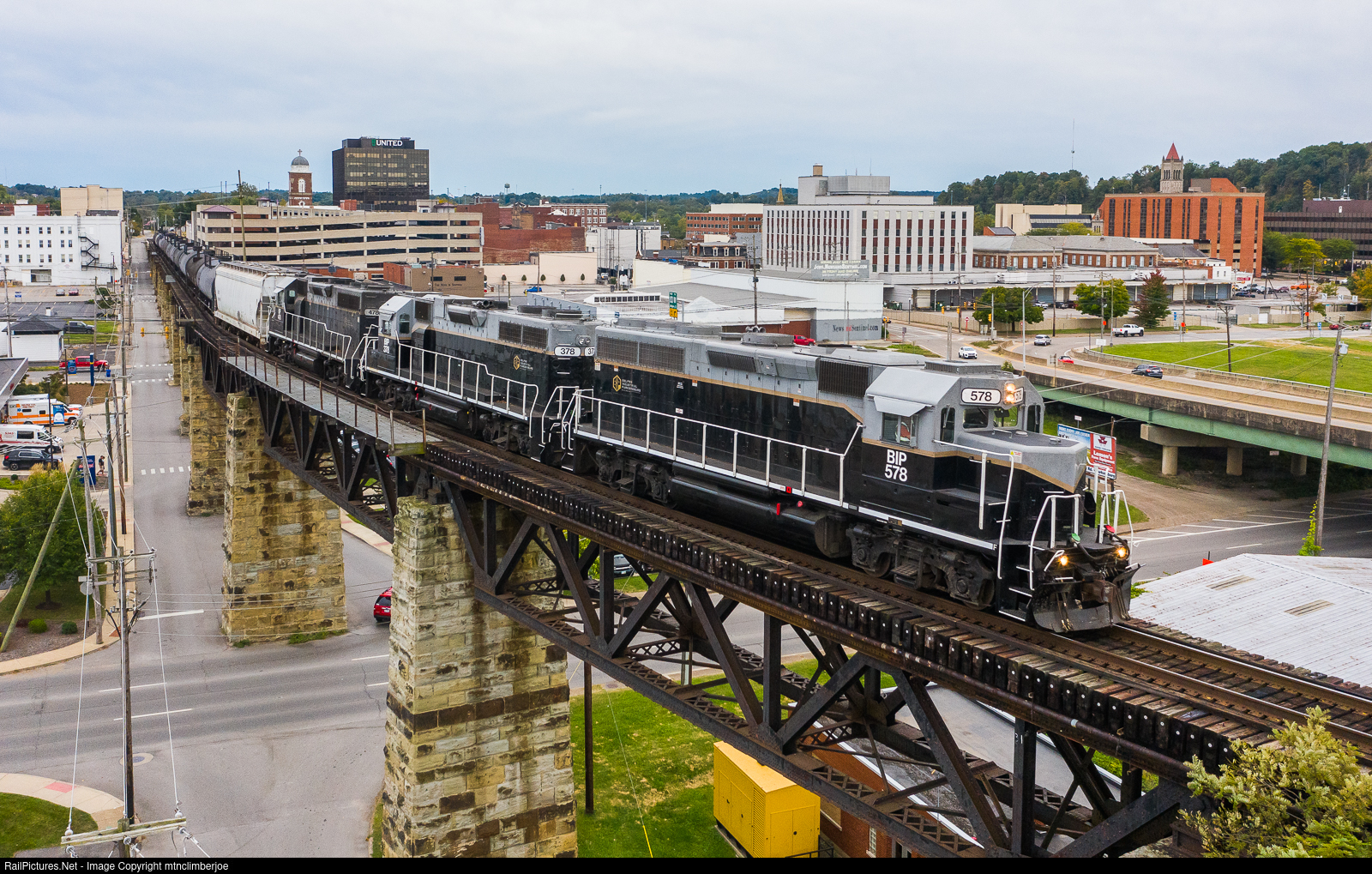 | An evening job on the Belpre Industrial Parkersburg Railroad has departed from the yard behind a trio of GP38N-3's and is climbing the approach trestle towards the Ohio River bridge in Parkersburg, West Virginia. and heads towards Ohio. This railroad was formed in 2020 to take over operations of the CSX Marietta Subdivision between Parkersburg, West Virginia and Relief, Ohio. |
