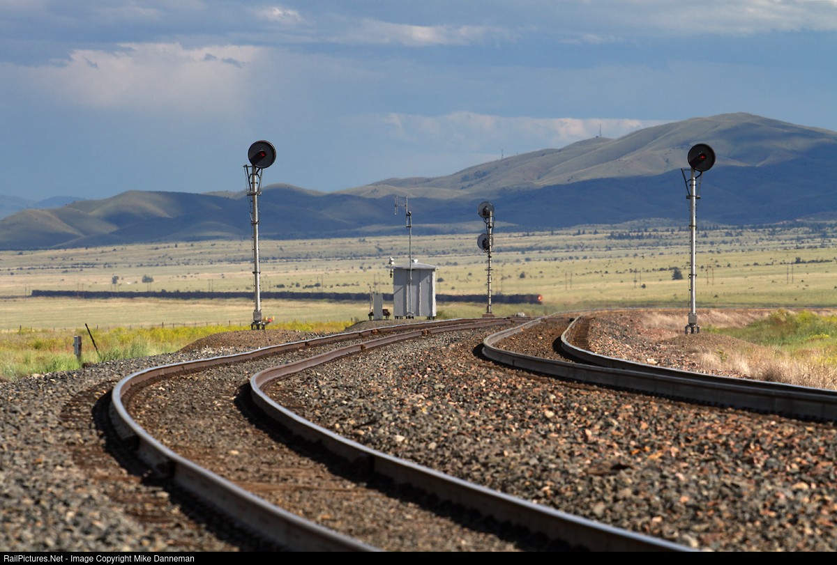 | Searchlight signals protect the west end of Winston siding atop Winston Hill on Montana Rail Link’s Second Subdivision on the afternoon of July 2, 2018. Slowly climbing the grade from Townsend is a westbound BNSF coal train negotiating the curving trackage up the hill. These searchlights have recently been replaced with more modern signals. |