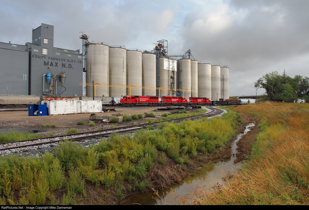 A Canadian Pacific local arrives in front of the grain elevators lining the tracks at Max, North Dakota, on August 28, 2018. This local works east out of Max on the railroad’s New Town Subdivision, and on this day, is powered by CP EMD SD60 No. 6245 and a pair of SD30C-ECOs.