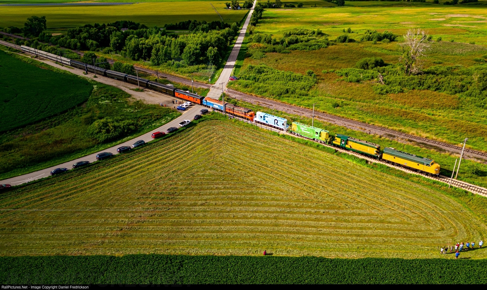 | A six-pack of F7 and GP7 diesels leads a combined coach train and Nebraska Zephyr during the Illinois Railway Museum's annual Diesel Days event, with C&NW 411 leading the way. |