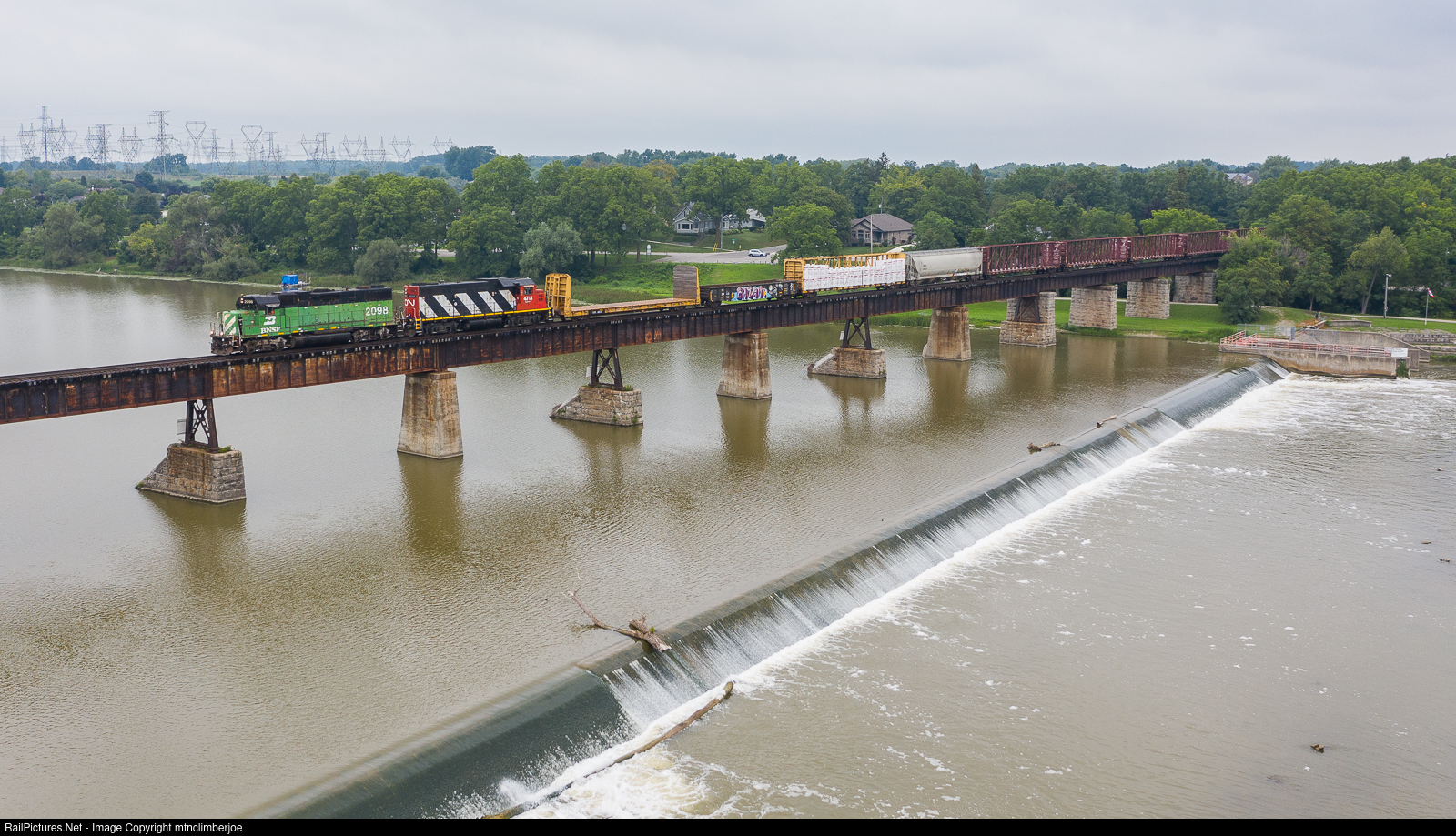 | Canadian National local L580 rolls across the Grand River in Caledonia as it heads south towards Hagersville after making a pick up from Nicholson & Cates in town. In the lead is former Burlington Northern GP38-2 BNSF 2098, on load to CN to repay horsepower hours.