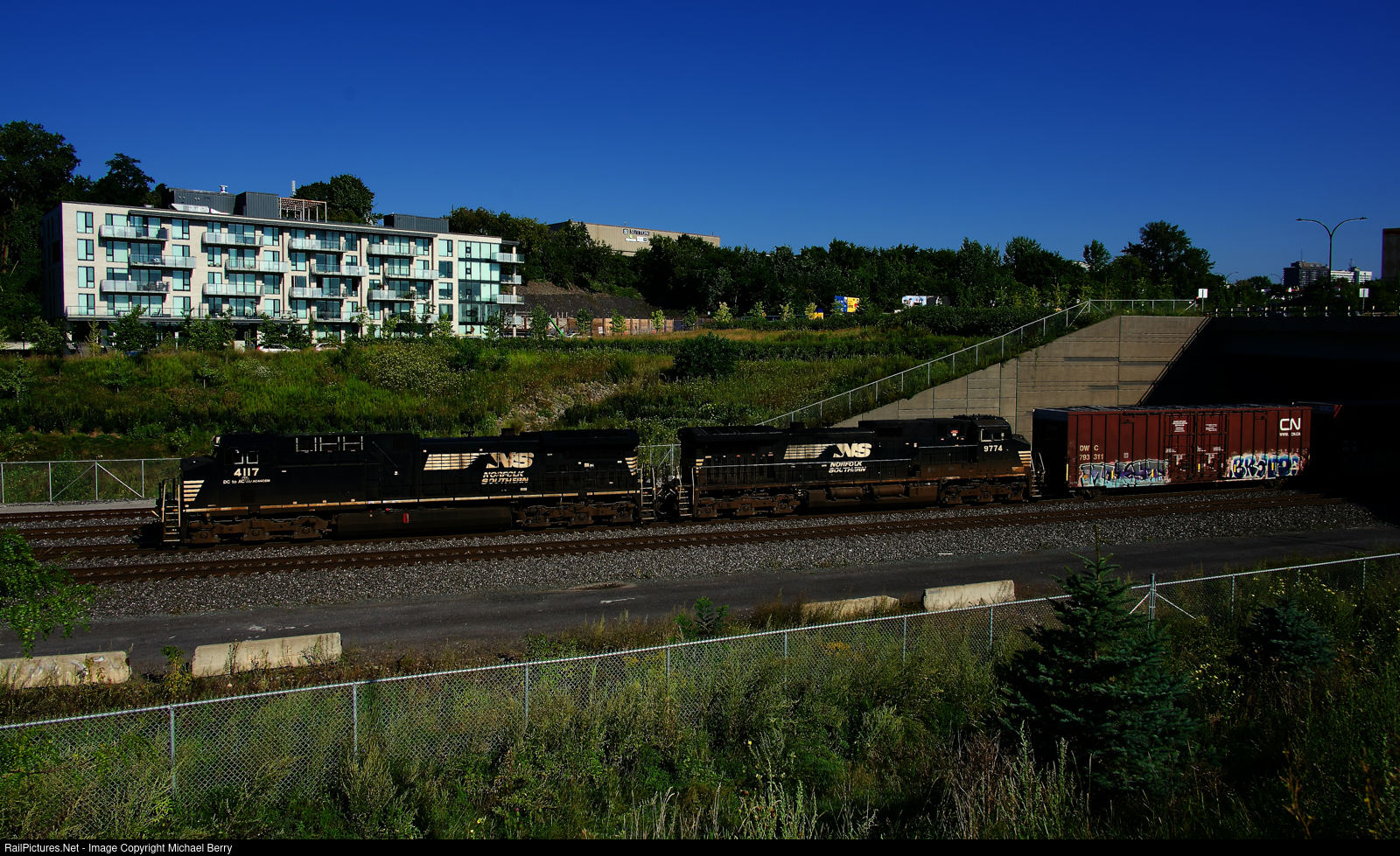 | Former and current Dash9s are lashed up as CN 529 heads west; close to its terminus of Taschereau Yard. Leader NS 4117 was rebuilt from NS 8797 in 2018, trailer NS 9774 still soldiers on as a Dash9, for now at least. |