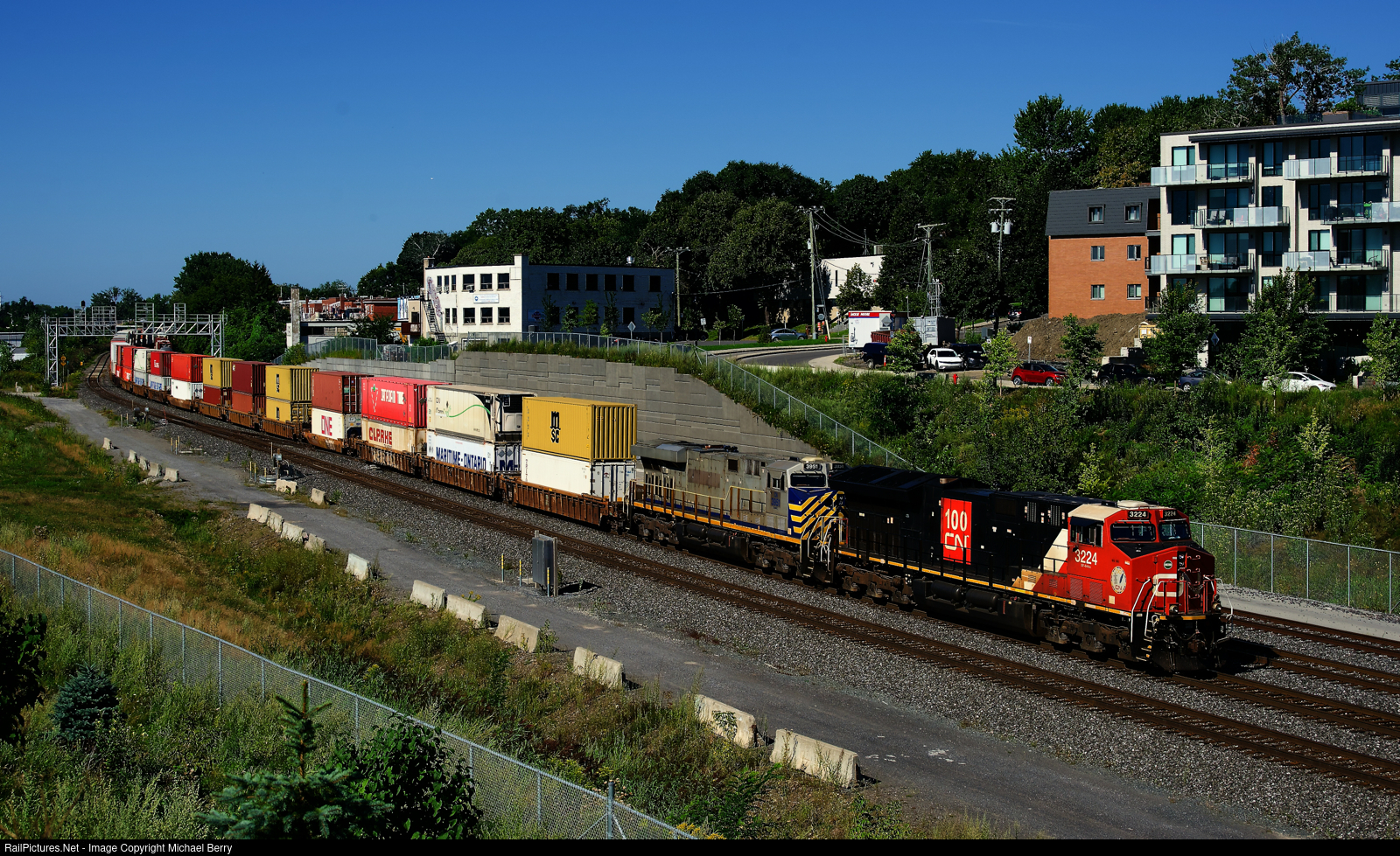 CN 100 unit CN 3224 and ex-CREX CN 3951 are arranged elephant style as CN's Toronto-Halifax intermodal train CN 120 heads east.