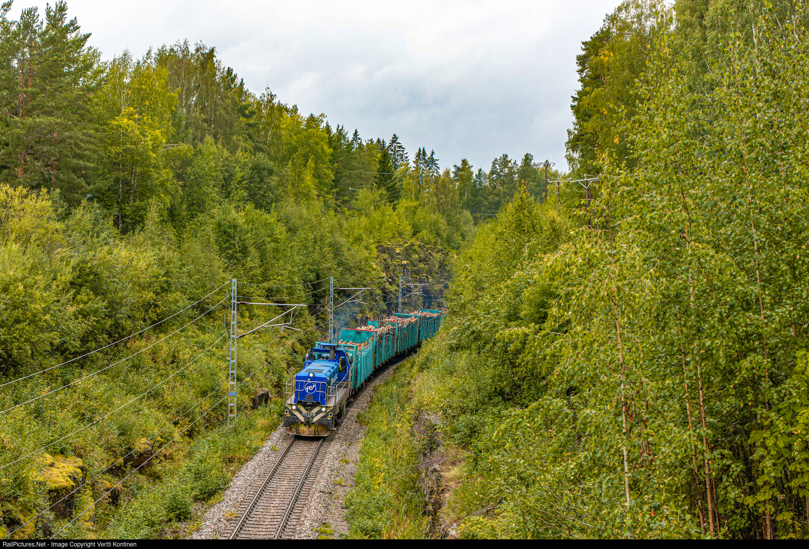 | The weekly Fenniarail timber train from Suolahti to Kouvola rolls through Kanavuori canyon with Dr18 class diesel electric leading |