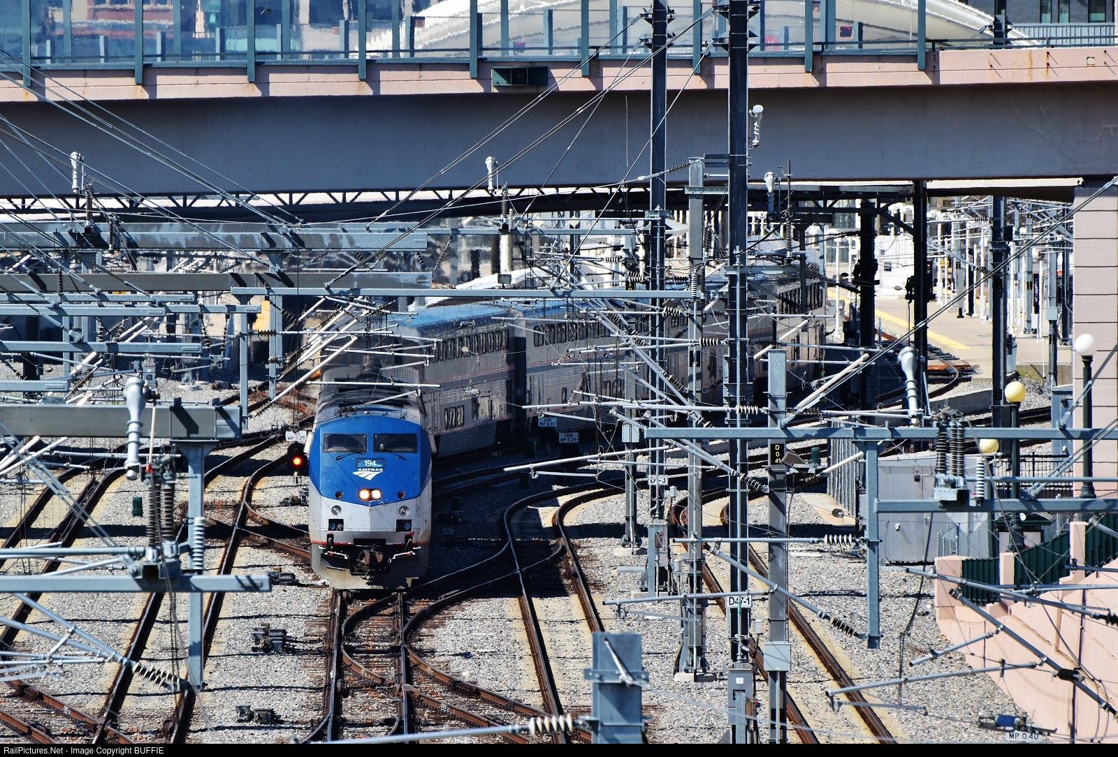 | Amtrak engine #194 (P42DC) backs the California Zephyr into Union Station in downtown Denver, Colorado. The myriad of catenaries support RTD's Commuter Rail trains that also use the station.