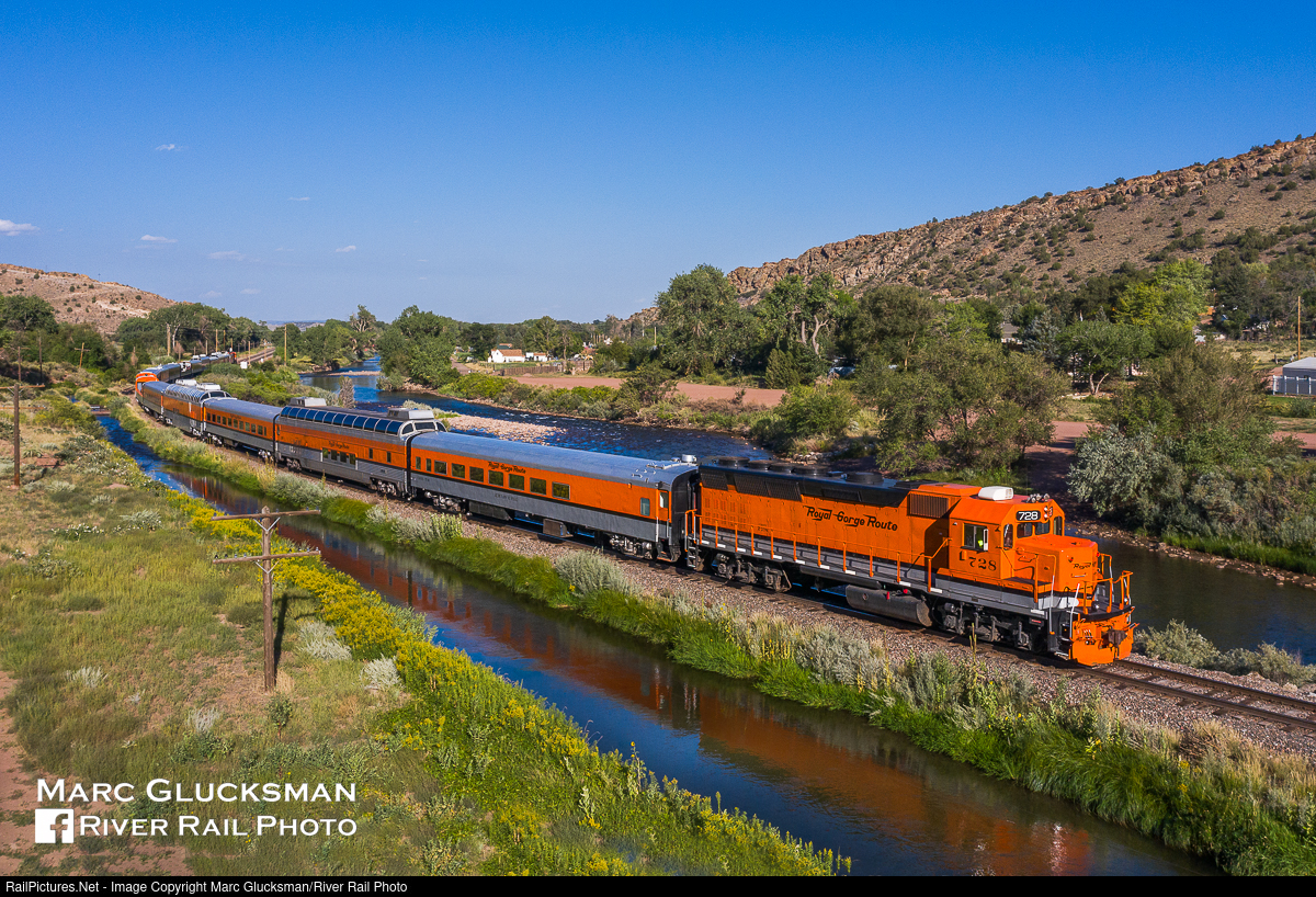 To Cañon And Back. Returning from Parkdale to Cañon City, Colorado, Colorado on a beautiful warm day Wednesday, September 1, 2020 afternoon, Royal Gorge Route Railroad's 17 car train (including four full domes) is seen next to the Arkansas River with GP40PH-2 CRRX 728 (ex-VRE V20, née-AWP 728, GP40, 2/1969 EMD) leading. The ride travels across the Royal Gorge, with this train sometimes making several trips a day. The railroad derives its paint scheme from the Denver and Rio Grande Western Railroad, the former operator of this line.