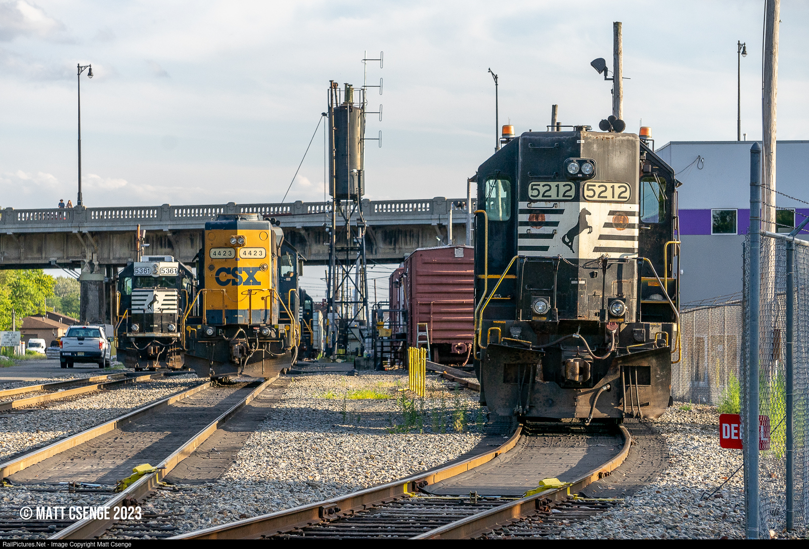 Norfolk Southern (NS) GP38-2 locomotives 5212 (nee Southern 5212; EMD, 1977) and 5361 (nee Conrail 8223; EMD, 1978), and CSX GP40-2 no. 4423 (nee Conrail 3338; EMD, 1978) are seen resting at the New York, Susquehanna & Western engine facility in Ridgefield Park, NJ.