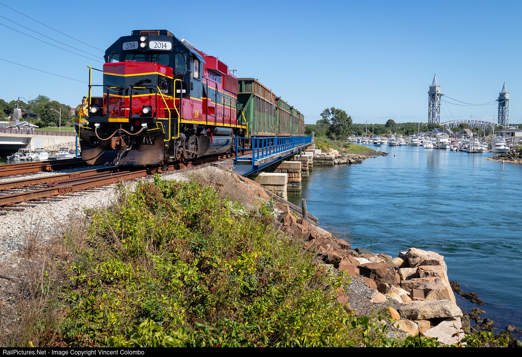 Mass Coastal 2014 is seen leading the northbound Energy Train at Cohasset Narrows in Bourne, MA. 2014 is an EMD GP59, built for NS in 1989. In March 2023, the locomotive was delivered to Mass Coastal, making it the railroad's 9th operable locomotive (not including the two LTEX units).