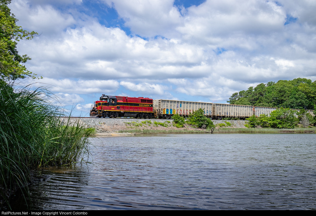| MC 2009 leads 15 empty hoppers southbound along the picturesque Falmouth Line at Monks Park in Bourne, MA. The Falmouth Branch is currently a target for being transformed into a rail trail which would connect the Shining Sea Rail Trail and the trail along the Cape Cod Canal. |
