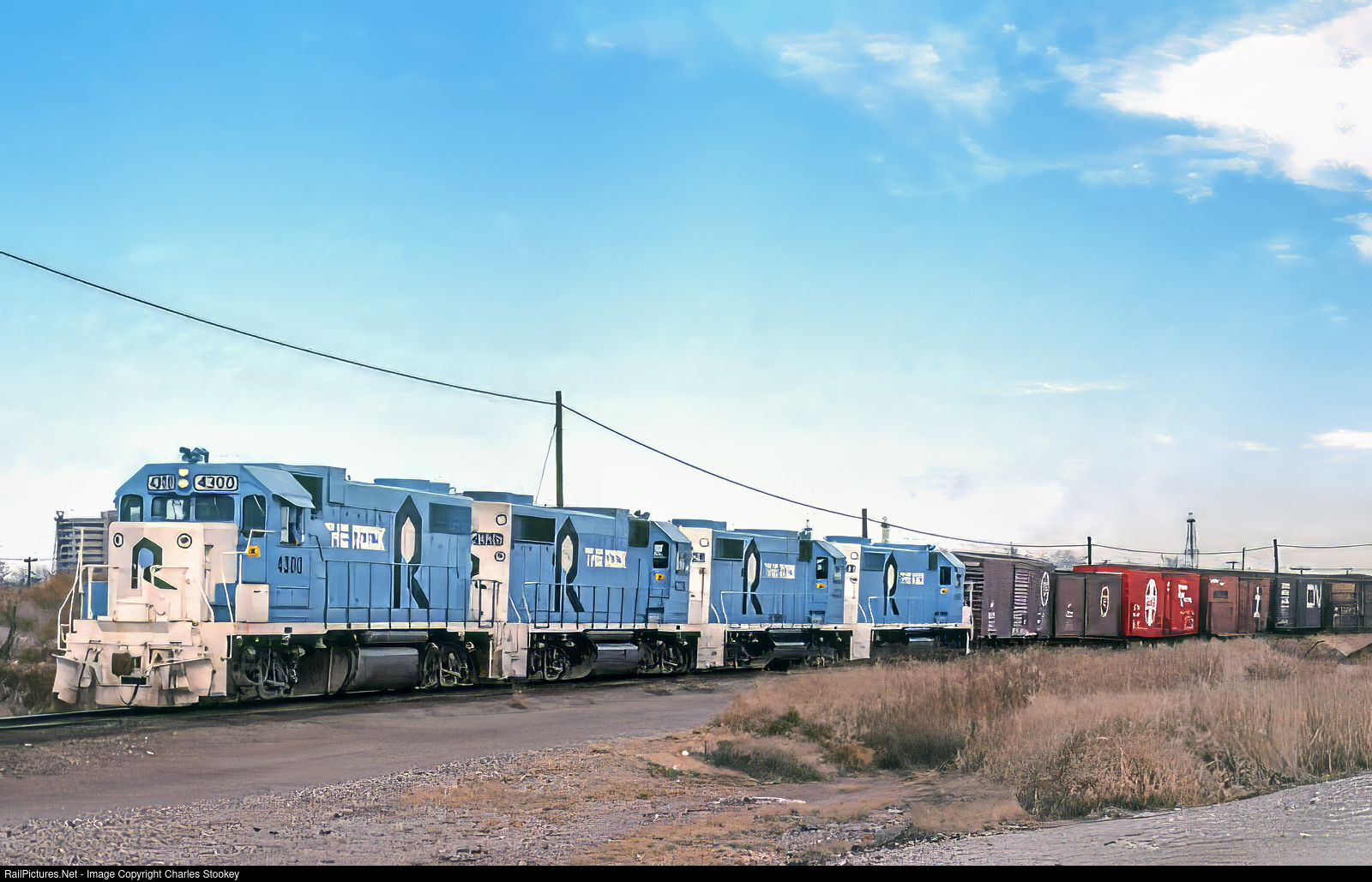 OKLAHOMA CITY (April) 1977 — Rock Island GP38-2 4300 and an all blue lashup lead a mixed freight westbound at Harter Yard. EMD delivered the 4300, named the Rock Islander, in August-September 1976. According to Railway Preservation news, “Rock GP38-2s 4300-4351 went to MP then UP via UP/MP merger. They were MP 2238-2289 then UP 2238-2289 then re#738-789.” My photo.