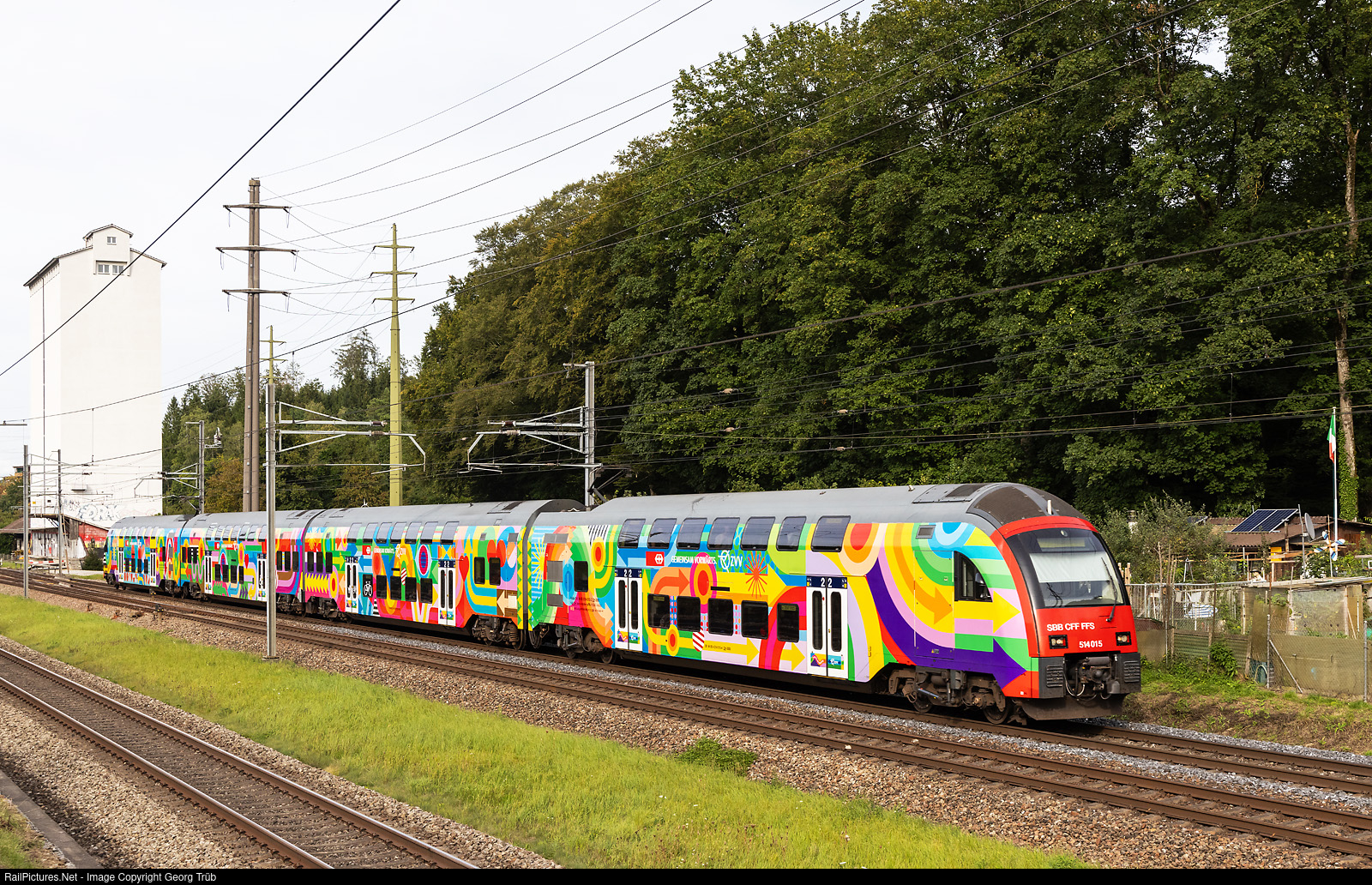 | Siemens built "DTZ" RABe 514 # 015 of the SBB got a wild publicity paint scheme for the Zürich Verkehrsverbund ZVV "gemeinsam vorwärts" (together ahead). The train is running the S 24 service 20467 from Weinfelden via Winterthur-Zürich Airport-Zürich-Thalwil to Zug, leaving Winterthur. |