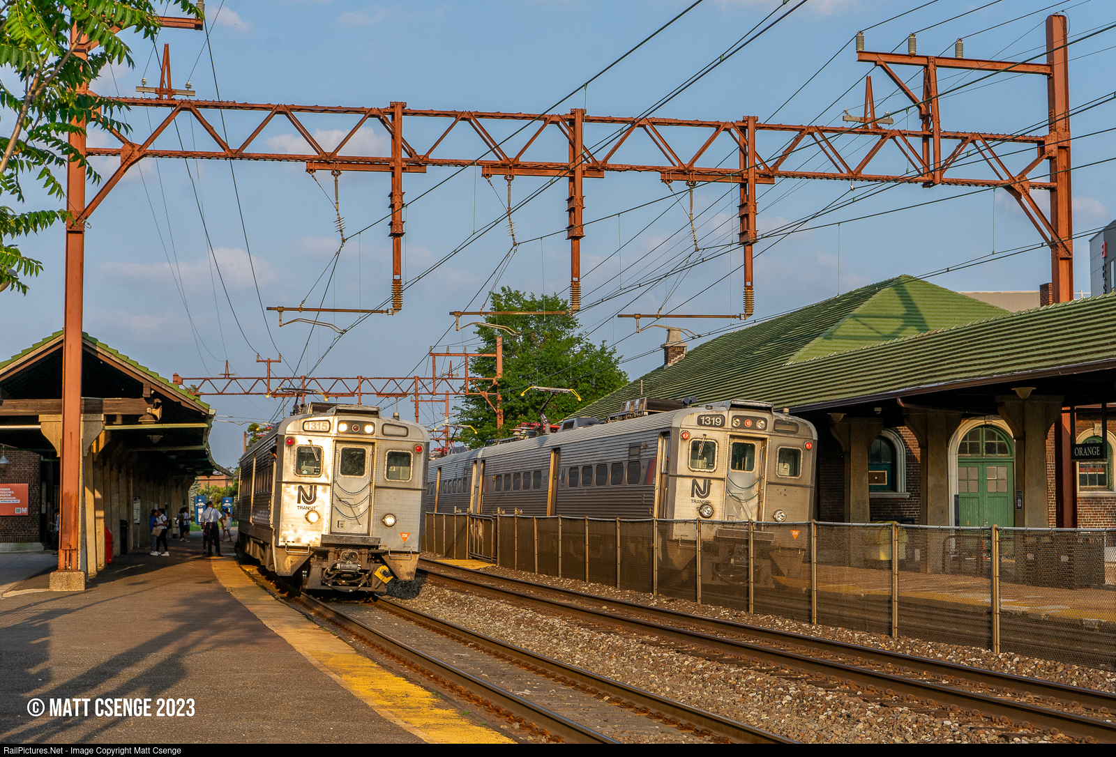 NJ Transit Arrow III no.s 1315 and 1319 (GE, 1977-1978) are on the west end of their respective trains - train 657 to Dover and train 334 to Hoboken - seen stopped at Orange Station. |