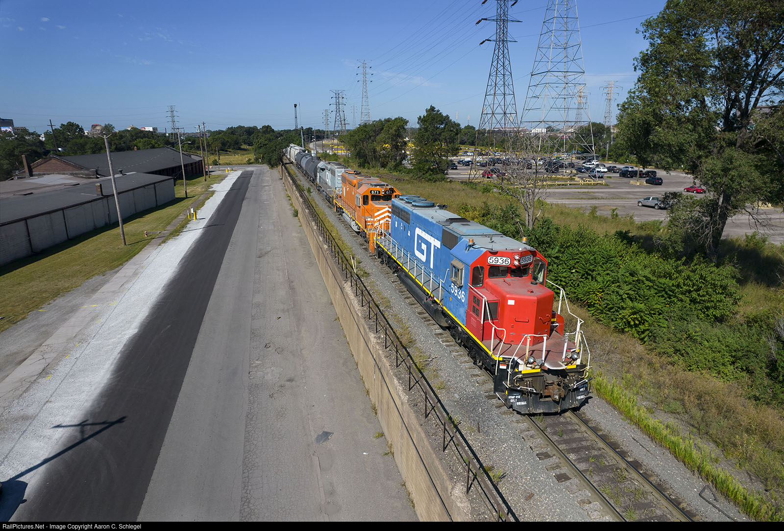 | Out of the shop, the GTW 5936 heads up One of Two Hump Sets Working the East End at Kirk Yard. The Hump Job takes head room out the DIXY Lead running by Mason Ave in Gary.