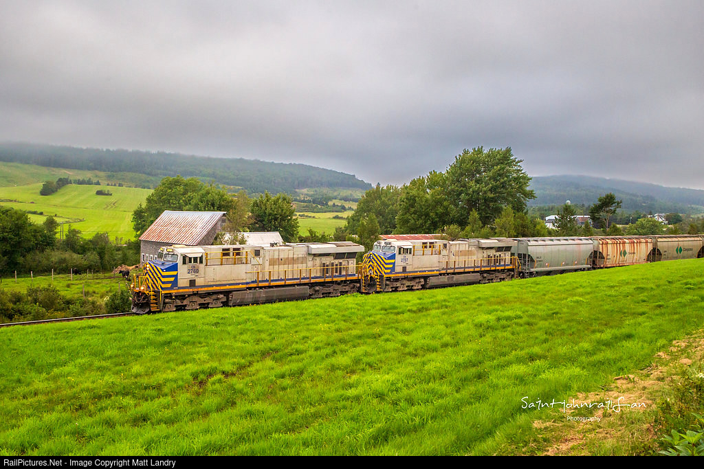 | A pair of ex CREX ponies power train 730 as they approach Norton, New Brunswick, passing the nice countryside of Southern New Brunswick.