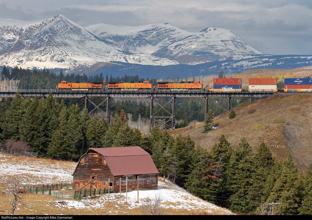 Stack over Two Medicine It’s autumn, but snow has already coated the jagged peaks in Glacier National Park. On October 8, 2018, a BNSF stack train crosses the oft-photographed Two Medicine Bridge at East Glacier, Montana. I know, it’s jokingly called ‘Too Photographed Bridge’ (and barn)—but when on Highway 2 through East Glacier, you might as well partake…