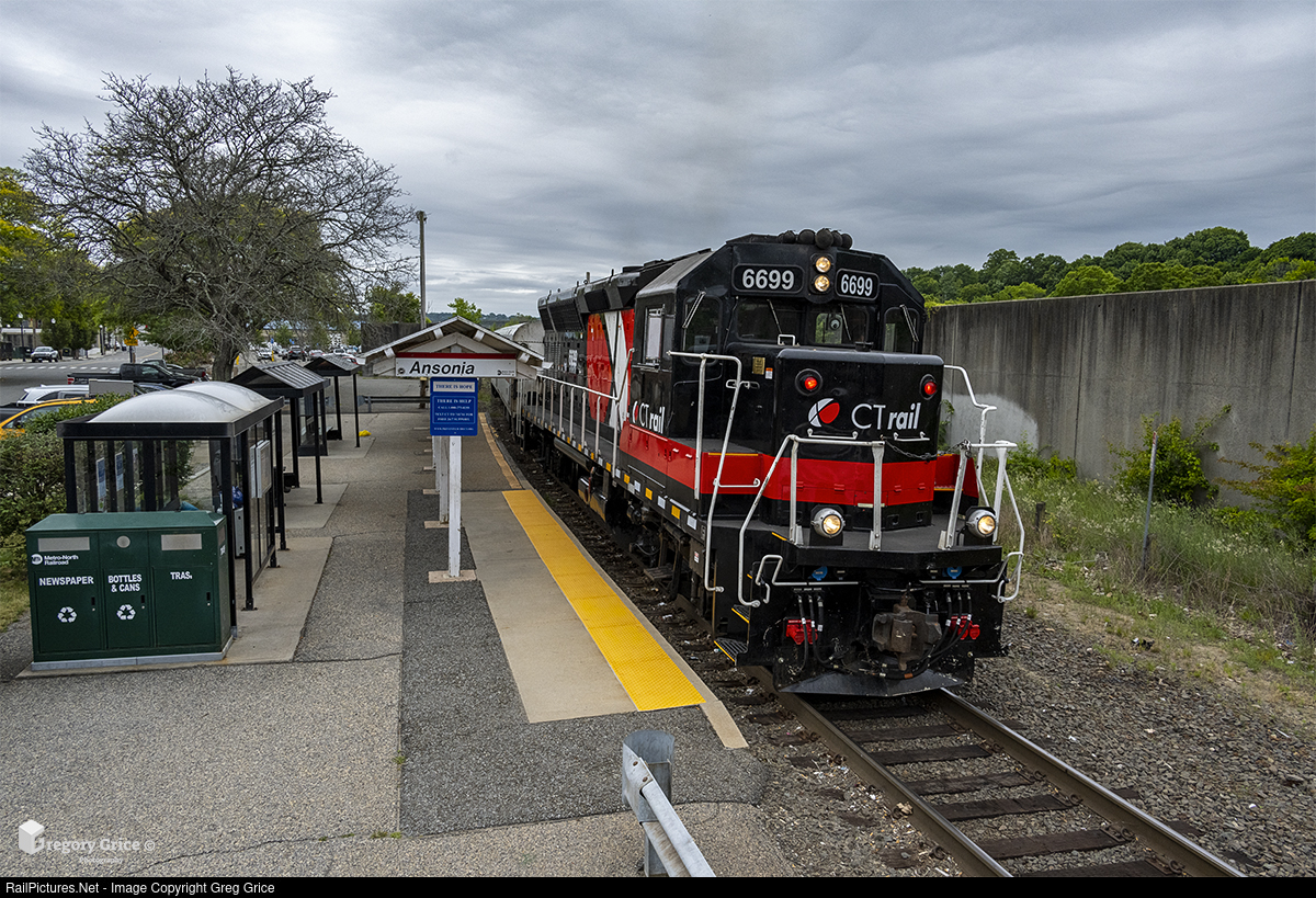On the morning of June 22nd, 2023, Connecticut Department of Transportation (CTDOT)/CTrail EMD GP40-3H 6699 leads Metro-North Railroad train 1908 into the station at Ansonia, Connecticut on the Waterbury Branch. The 6699 is on lease to Metro-North to assist with fleet size while the remainder of their Brookville BL20GHs are sent out for rebuild.