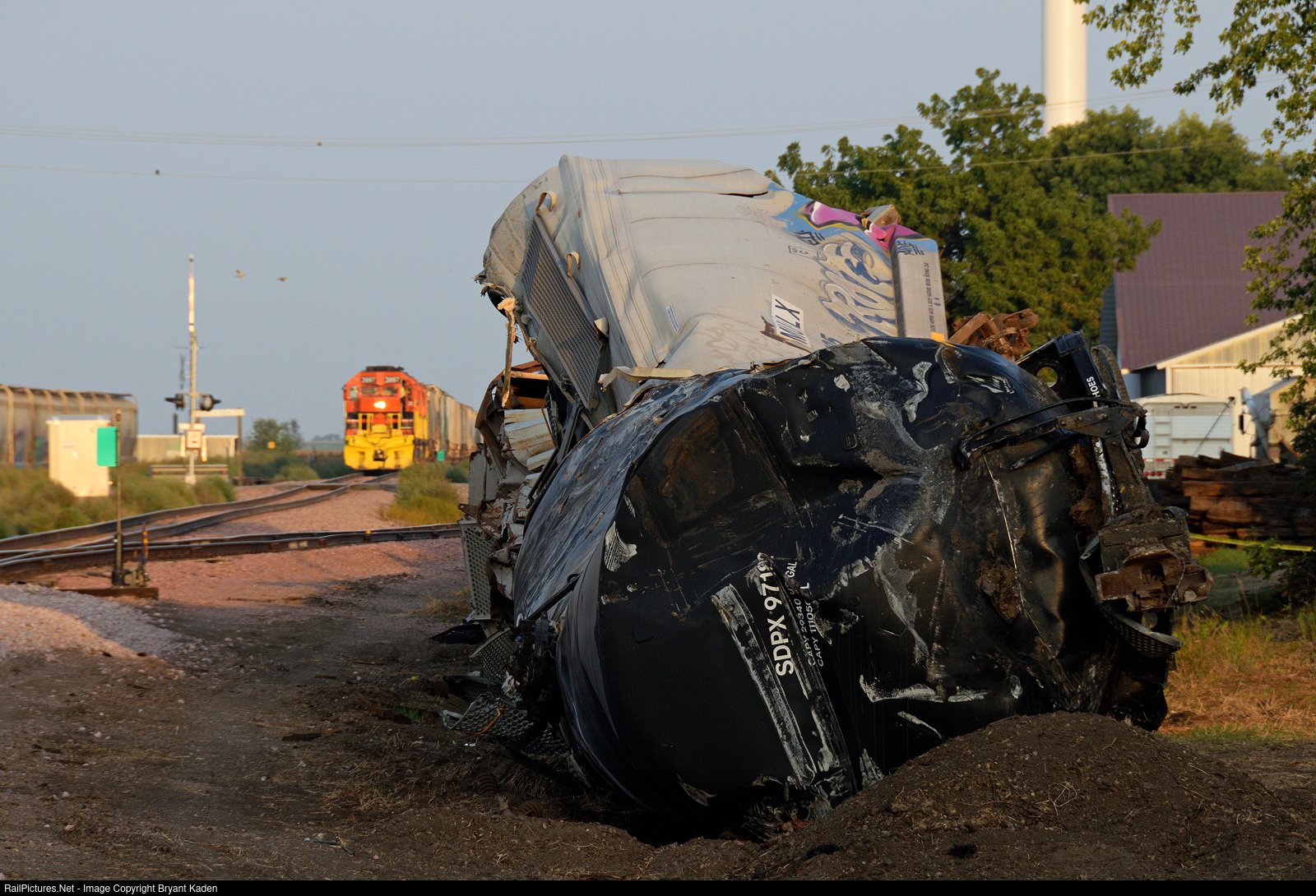 A westbound RCPE train is being tied down in the distance as the remnants of a recent derailment await further cleanup in the small town of Elkton, SD.