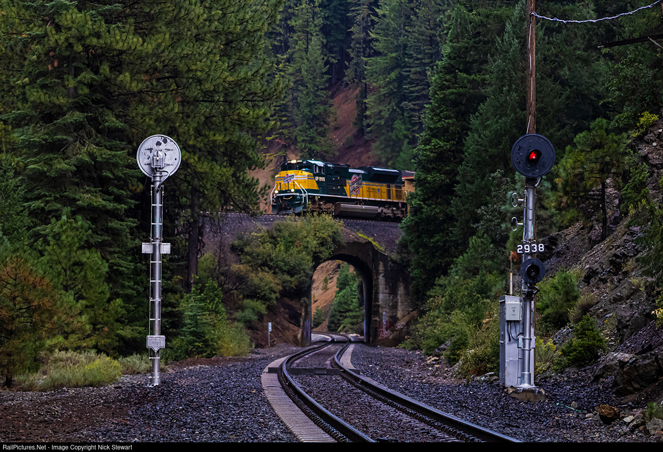 | Union Pacific's Chicago & North Western heritage unit appears briefly between the trees on the upper part of the historic Williams Loop, located near Spring Garden, California. In a few moments it will appear in the tunnel below and split the pair of searchlight signals that were installed by the Western Pacific over half a century ago. |