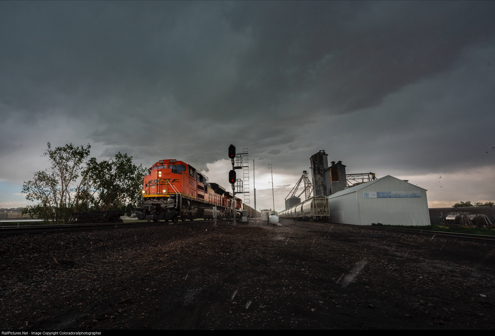 Inside a high precipitation cell at Keenesburg, CO on a stormy June day BNSF momentarily shut down operations after a Severe Thunderstorm Warning was issued stopping this westbound in a hurry before my camera. |