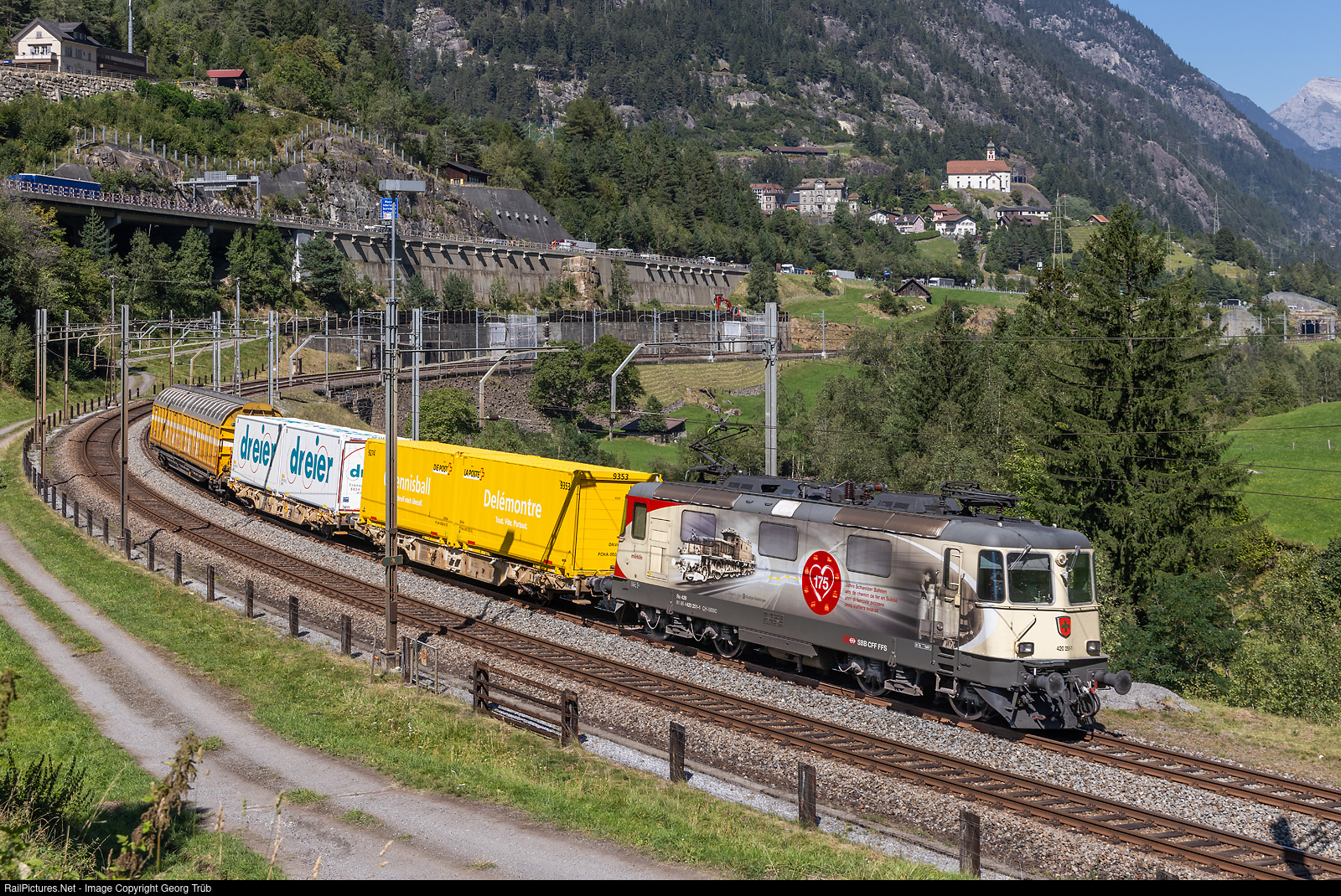 | Re 420 # 251 (Re 4/4 II # 11251) of the SBB in the publicity paint scheme for 175 years railway in Switzerland pulls the mail train 50021 from Härkingen to Cadenazzo over the Gotthard mountain line in the Wattinger curve between Gurtnellen and Wassen. |