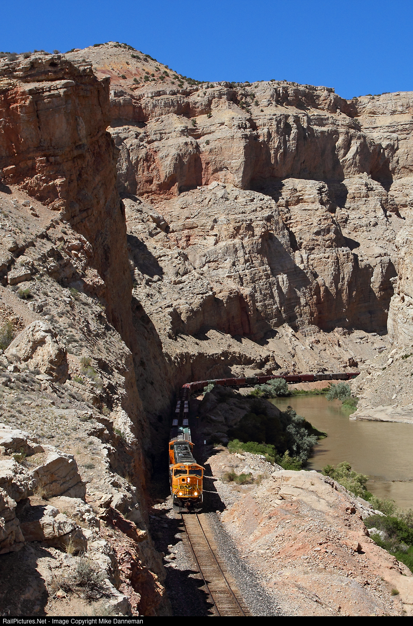 Shadows are lengthening as two EMD SD70MACs power BNSF’s Cowley turn, a local that operates out of Greybull, Wyoming, through rugged Sheep Canyon on June 22, 2016. The southbound train is following the Bighorn River just south of Spence on BNSF’s Casper Subdivision.