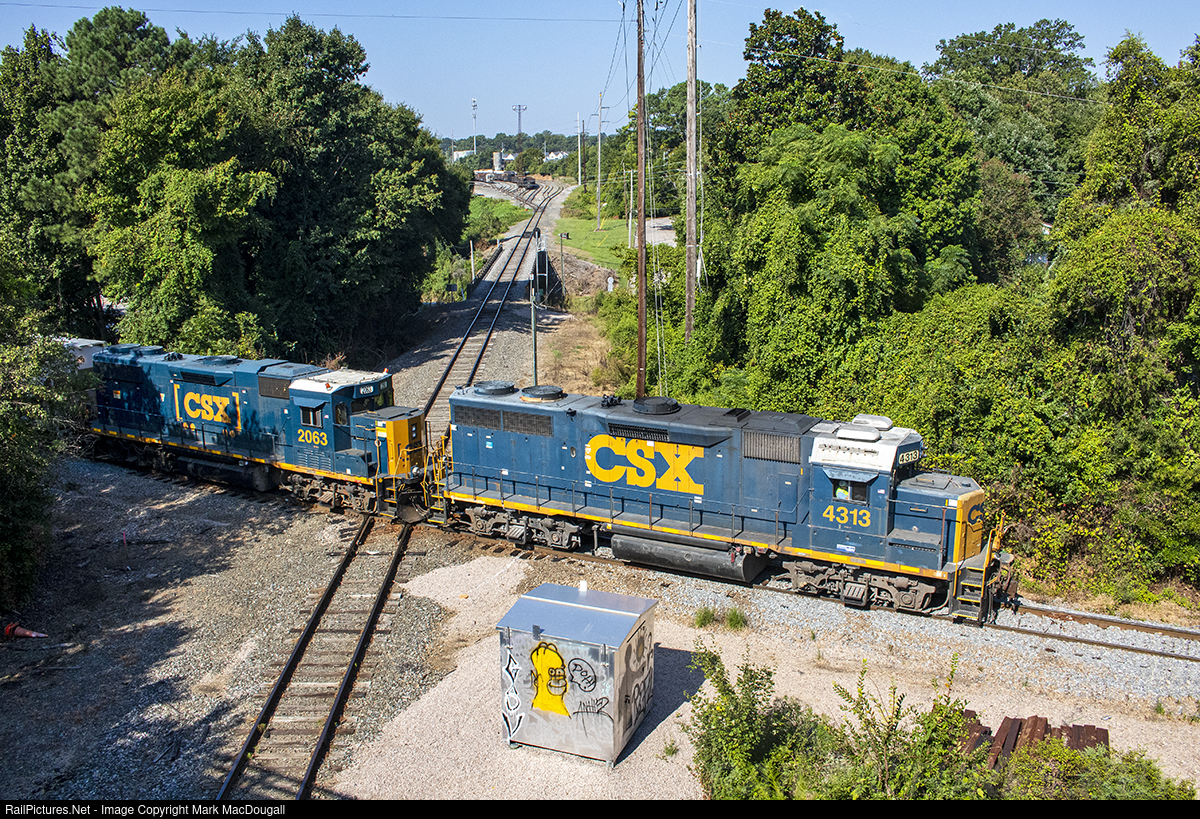 A former Reading/Delaware & Hudson GP39-2 leads Norlina Sub local L617 over the NS diamond at Edgeton, north of downtown Raleigh. CSXT 4313 was built in 12/74 as RDG 3407, and ended up on the D&H before being acquired by CSX in the early 90's. This is part of the old Seaboard line to Petersburg, VA, which NC and VA plan to rebuild and upgrade into a high speed passenger main.