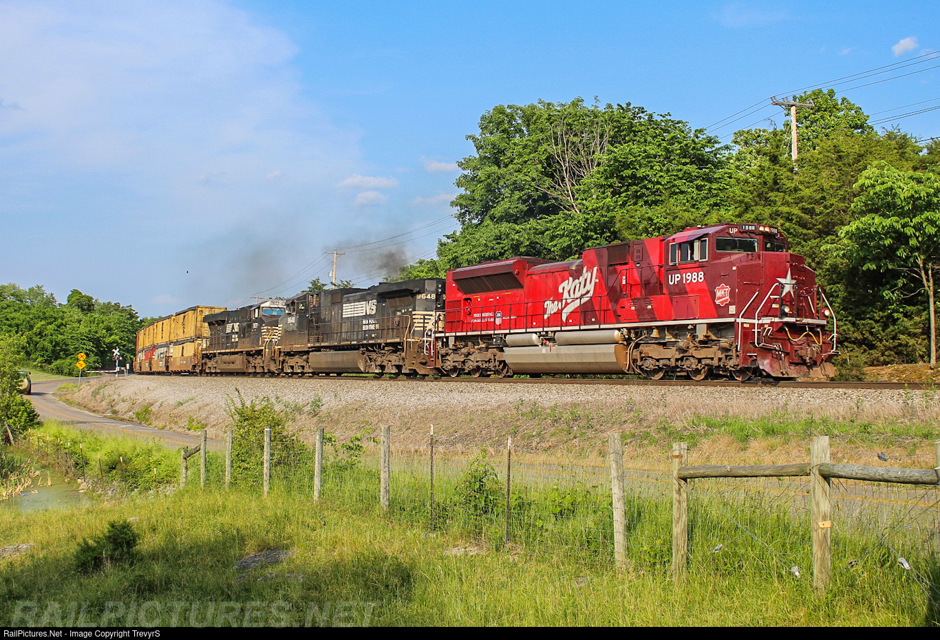 NS 13Z rushes down the Pulaski district on the far side of Marion, VA. A very unusual leader was in charge of the train today-the Katy heritage unit. It was the first time a UP heritage unit led a train around this area in years.