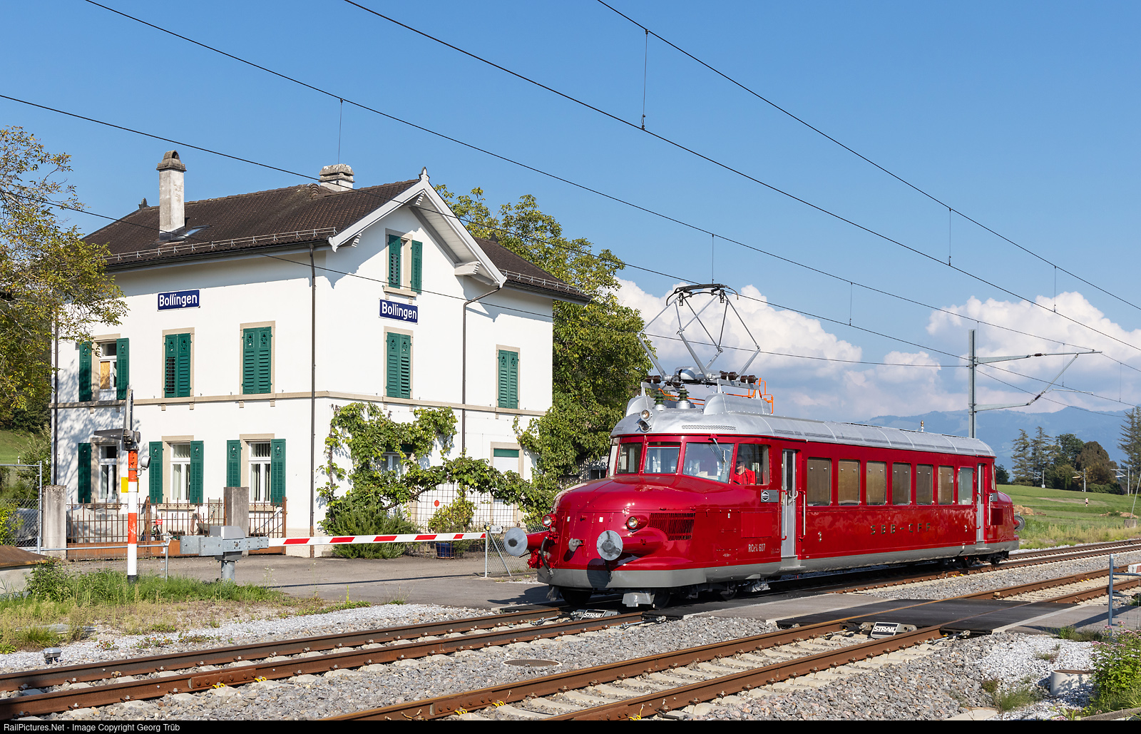 "Red Arrow" RCe 2/4 # 607 of the Oensingen-Balsthal-Bahn (OeBB) is on a private charter trip this day, now leaving Bollingen as train 31553 via Rapperswil-Pfäffikon SZ to Murg-Unterterzen. The legendary electric light railcar was delivered to the SBB in 1938 as the last of a seven-car series, designated Re 2/4 # 207. Futuristic for the time was the design with many curves and glass, the low car floor, the top speed and the view through the entire train with an open cab. Originally, these railcars with 3rd class seating were intended for use at off-peak times and on branch lines. However, these connections became so popular in a short time that their capacity became too small. In 1949, therefore, conventional buffers/couplers were added to carry up to two trailer cars. The only interior rebuild took place in 1955/56 in the SBB workshop in Zurich: The rail runabout received, among other things, new comfortable upholstered seats with folding backrests as well as longitudinal luggage racks and was from then on primarily used for social trips. After its purchase by OeBB in 1974, the red railcar became the "Blue Arrow". On the occasion of the 1988/89 overhaul at BLS Lötschbergbahn in Spiez, however, it already blushed again and on the occasion of the 2022/23 overhaul, the railcar's exterior was restored to its mid-1950s condition, i.e. to match its interior. Thus, it is today the only original "Red Arrow", which is operational and can be rented for special trips.