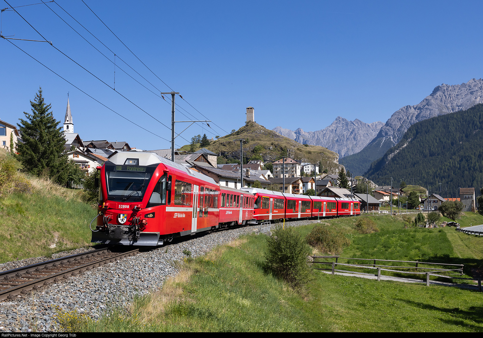 | Regional train 1945 of the Rhaetian Railway from Scuol-Tarasp via Zernez-Samedan to Pontresina, is leaving Ardez. In front cab car Bt # 52808, then bycicle car WS # 3914 (built 1956, rebuilt 2008) and railcar "STZ" ABe 4/16 # 3103 shoving. |