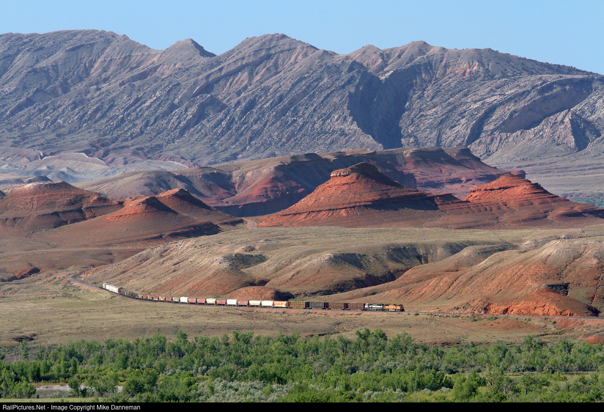 BNSF’s Cowley turn out of Greybull, Wyoming, scrurries through some remarkable scenery between Spence and Himes on the morning of June 26, 2023. In a few minutes, the local powered by a pair of EMD SD70MACs, will be stopping to switch the Georgia-Pacific Gypsum plant at Himes where they will set out the four empty spine cars up front.