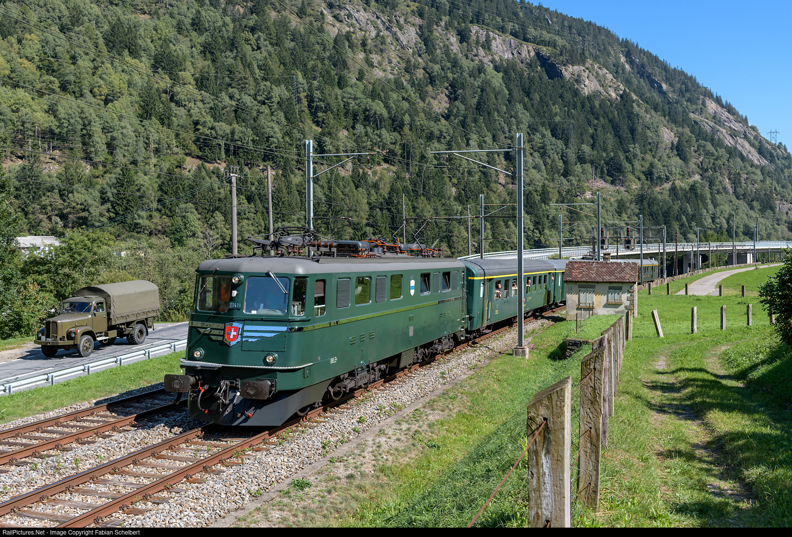 | The San Gottardo adventure train during the ascent of the Gotthard south ramp shortly after Rodi-Fiesso, where the track runs parallel to the road. The Ae 6/6 #11411 was cleaned and polished by the engine foreman before the trip and shines beautifully in the sun. |