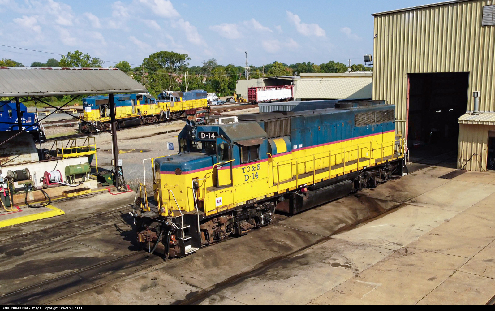 | Texas Oklahoma & Eastern D-14, a 1971 model GP40, is seen here at the DeQueen shops getting serviced on a hot September morning. The locomotive was purchased new by the TO&E and has been on the property since then. |