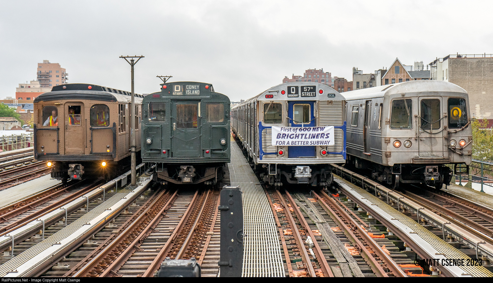 Lineup. The NY Transit Museum fleet is seen getting in positions for the traditional lineup at Ocean Parkway Station following the end of the first day of the Parade of Trains. From left to right (and oldest to newest) are: AB Standard no. 2392 (ACF, 1914-1919) R1 no. 381 (ACF, 1930-1931) R32 no. 3360 (Budd, 1964) R46 no. 5658 (Pullman-Standard, 1974-1975) The R32 is sporting a replica of a banner from a celebratory trip the cars made in 1964, from the New York Central Railroad's Mott Haven Yard to Grand Central Terminal. The banner was donated to the museum along with a similar "last of 600 new Brightliners" that was created for the cars' last run in 2022.
