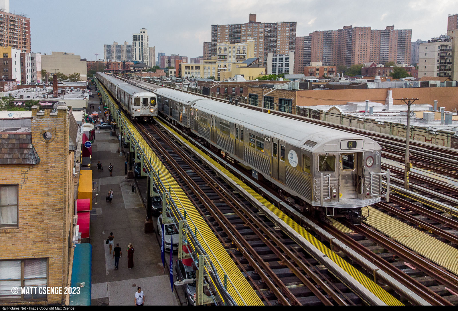 New York City Transit Authority (NYCTA) R38 no. 4029 (St. Louis Car Co., 1966-1967) is seen on the end of a NY Transit Museum train laid up between Ocean Pkwy and Brighton Beach Stations on the BMT Brighton Line, while R46 no. 5802 (Pullman-Standard, 1974-1975) passes with a Manhattan-bound Q train.