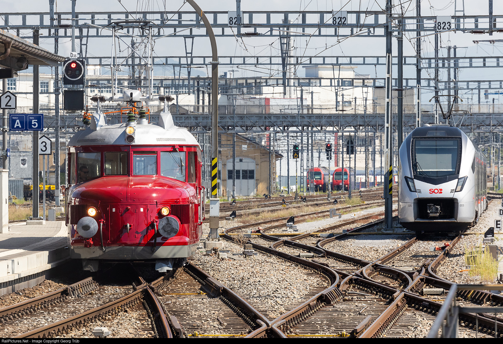 "Red Arrow" RCe 2/4 # 607 of the Oensingen-Balsthal-Bahn (OeBB) is on a private charter trip this day, entering Rapperswil coming from Bollingen. On the right the "Flirt" RABe 526 # 005 of the Südostbahn (SOB). The legendary electric light railcar was delivered to the SBB in 1938 as the last of a seven-car series, designated Re 2/4 # 207. Futuristic for the time was the design with many curves and glass, the low car floor, the top speed and the view through the entire train with an open cab. Originally, these railcars with 3rd class seating were intended for use at off-peak times and on branch lines. However, these connections became so popular in a short time that their capacity became too small. In 1949, therefore, conventional buffers/couplers were added to carry up to two trailer cars. The only interior rebuild took place in 1955/56 in the SBB workshop in Zurich: The rail runabout received, among other things, new comfortable upholstered seats with folding backrests as well as longitudinal luggage racks and was from then on primarily used for social trips. After its purchase by OeBB in 1974, the red railcar became the "Blue Arrow". On the occasion of the 1988/89 overhaul at BLS Lötschbergbahn in Spiez, however, it already blushed again and on the occasion of the 2022/23 overhaul, the railcar's exterior was restored to its mid-1950s condition, i.e. to match its interior. Thus, it is today the only original "Red Arrow", which is operational and can be rented for special trips.