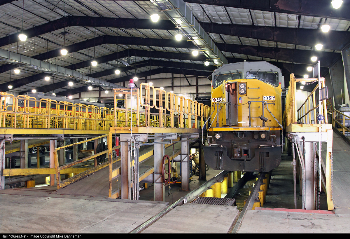 Union Pacific EMD SD9043MAC No. 8046 is in for repair at the east side building at the large Diesel Shop at the railroad’s Bailey Yard in North Platte, Nebraska, on May 4, 2011.