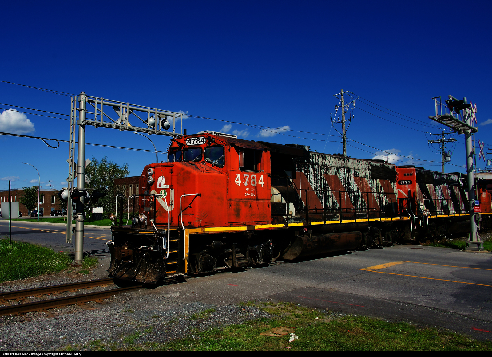 CN 526 is westbound over Rue de la Province with a faded CN 4784 leading. CN 4784s original number (5584) is slightly visible under the cab window.