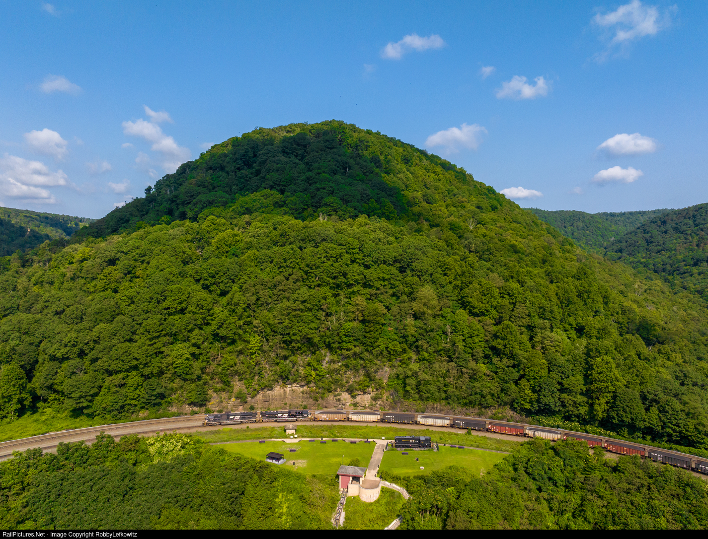 NS 7236, along with another ACU, shove a doubled-up loaded coal train down the mountain as they pass the world-famous Horseshoe Curve and head into Altoona. |