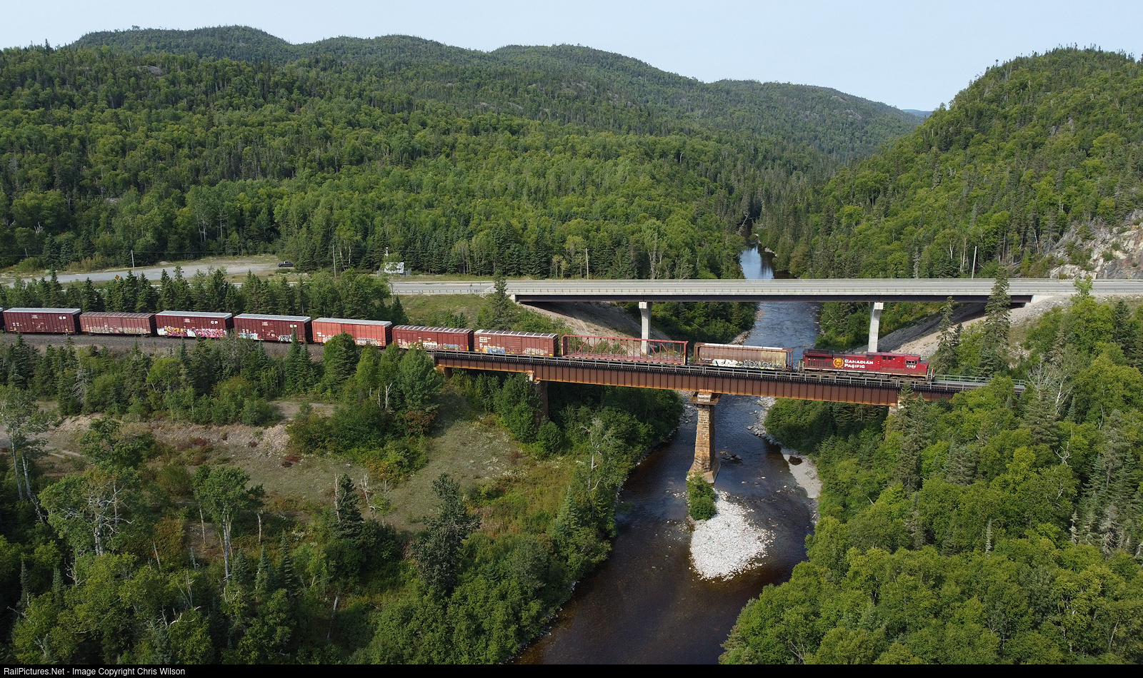 CP AC4400CWM 8134 pulls a Thunder Bay, ON - Toronto Yard, ON freight across the Steel River bridge. Trans Canada Highway #17 passes adjacent, both bridges were rebuilt in the mid 00's.