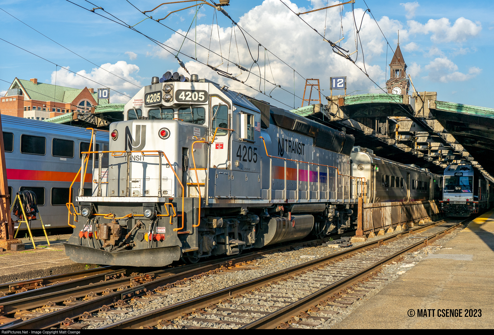 NJ Transit GP40PH-2B no. 4205 (EMD, 1965-1969) is in charge of Montclair-Boonton Line train 1009 as it departs Hoboken Terminal. The geep is one of two that sports the "speed stripe" paint scheme rather than the "disco stripes." |