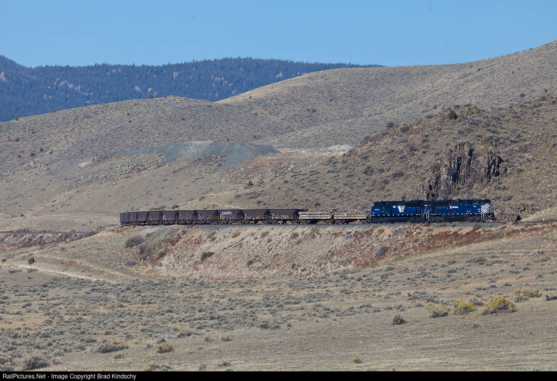 | "Passing Pipestone on Pipestone Pass" An MRL ballast train shoves up Pipestone Pass to Conda Mining, with the engines passing under an outcropping of pipestone. |