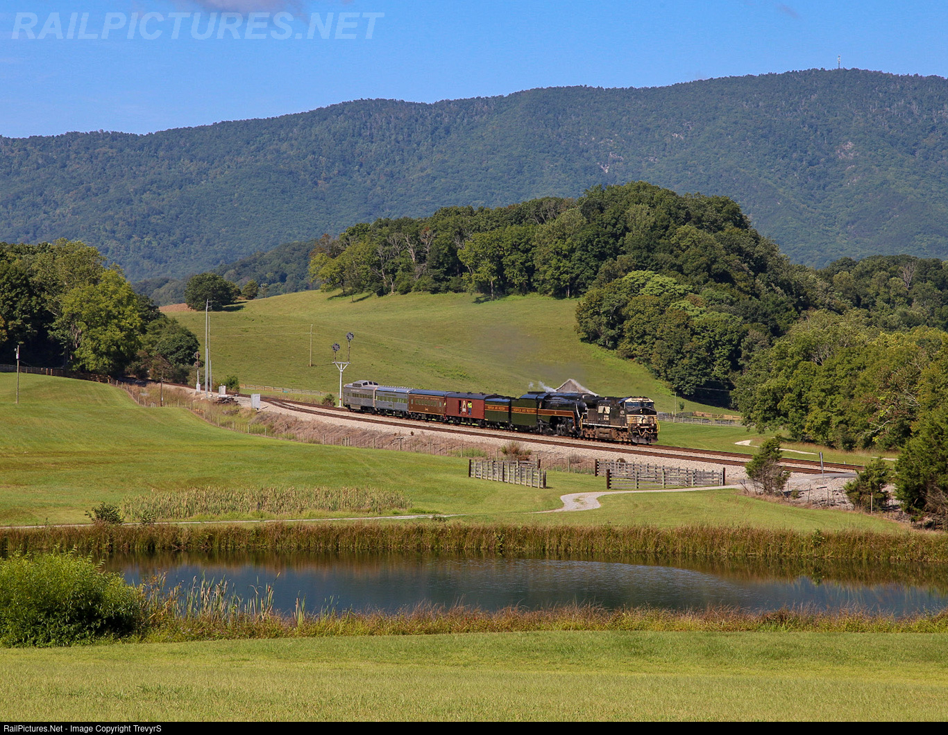 NS 957 rolls up the Shenandoah Valley on a perfect morning. N&W 611 the “Queen of Steam” trails behind the NS unit as it travels to Waynesboro, VA. The engine is scheduled to run excursions this fall on the Buckingham Branch railroad and 611 is being ferried from the Virginia Museum of Transportation to the BB interchange track.