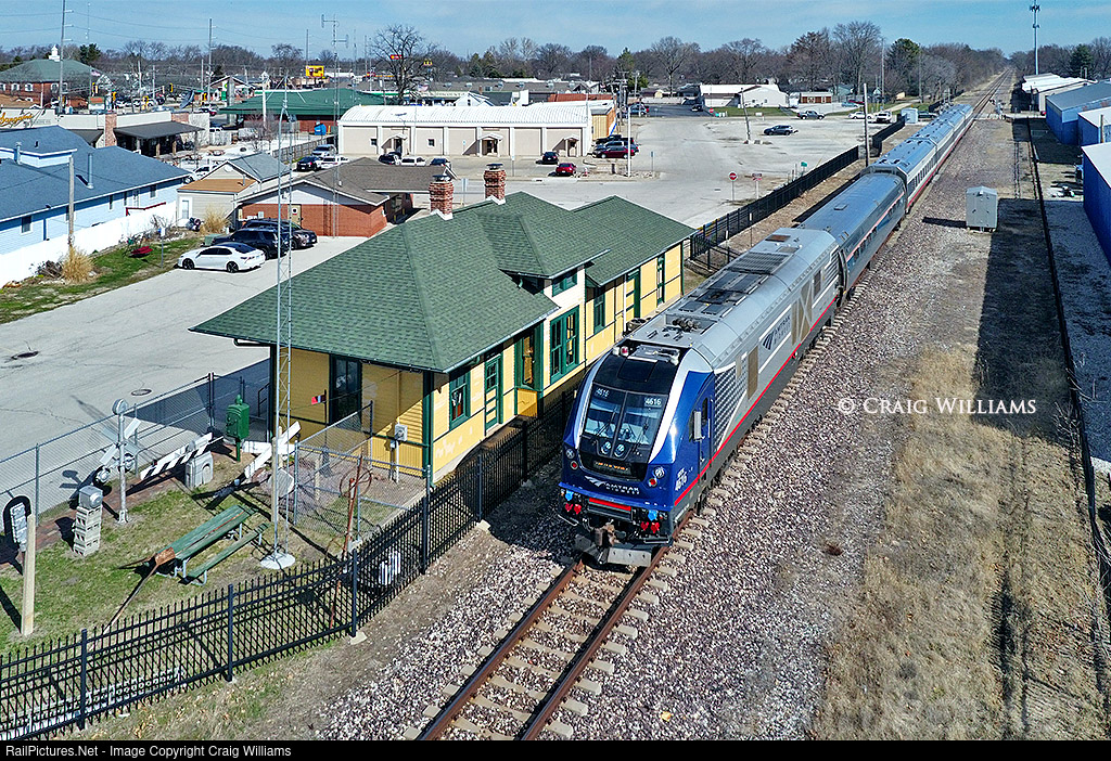 | A nice depot at Chatham, frames up well as this St. Louis bound Lincoln service train #301 passes. The train works towards 90mph as they roll down Illinois's Express highway on a 5 hours and 7 minute trek over the 284 miles between Chicago and St. Louis. Work continues to get this route over 100 mph. |
