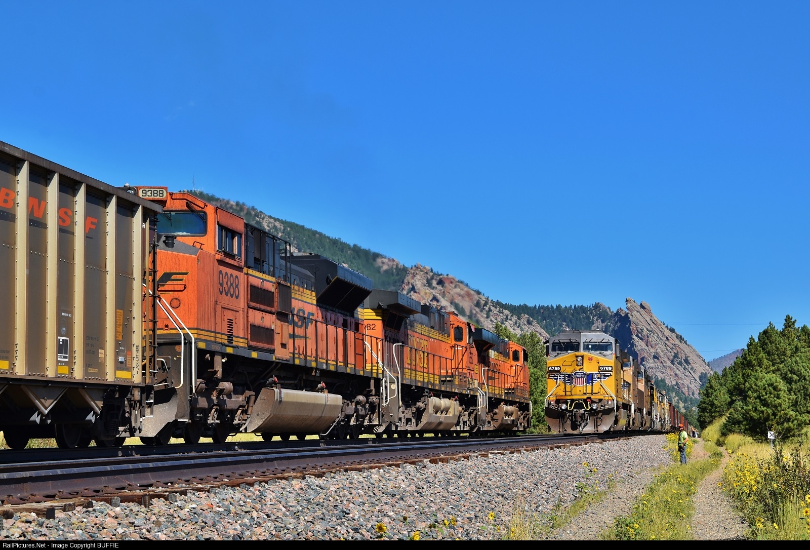 UP 6789 (AC4400CW) meets a BNSF coal train at Plainview, Colorado.