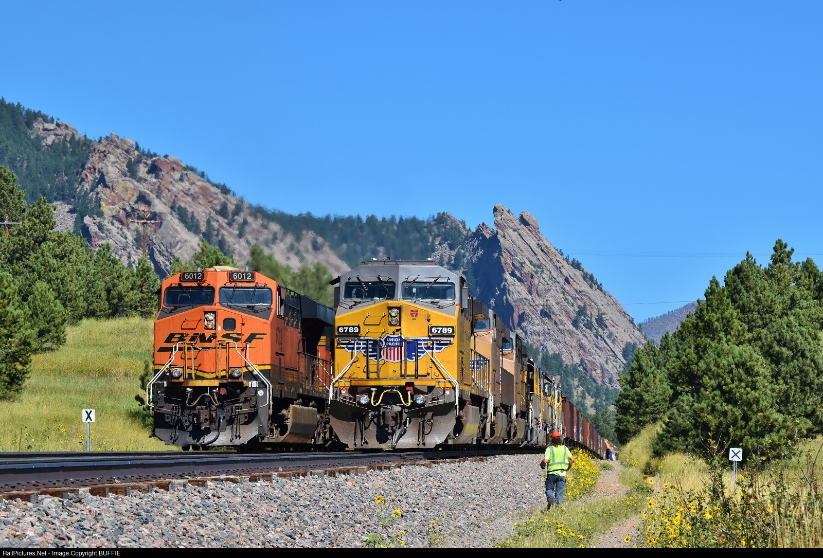 With the Boulder Flatirons in the background, a UP crewman walks back to his motor as BNSF 6012 (ES44AC) passes and heads up the Moffat Tunnel Sub.