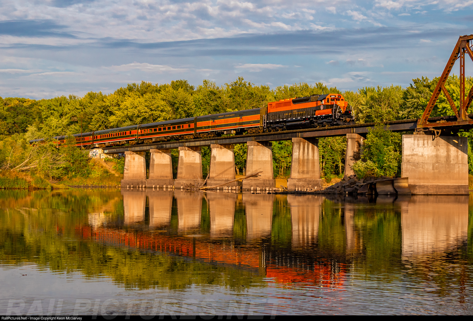 The Minnesota Transporation Museum's "Great Northern 325" on a photo passenger special crossing the St. Croix River from Wisconsin into Minnesota. The GN 325 was repainted earlier in 2023 at Relco in Albia, IA thanks to a generous anonymous donor. Though the original plan was always Big Sky Blue, one can't deny how sharp the 325 looks "as delivered".