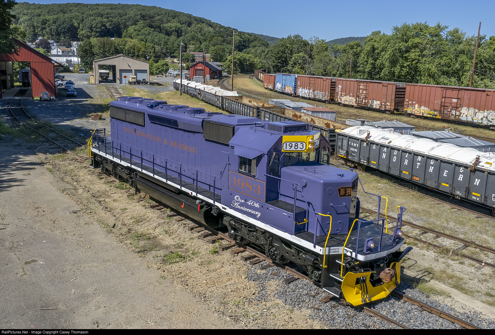 | Reading and Northern Railroad's "40th Anniversary" SD40-2 #1983 debuted from the West Cressona paint shop today, wearing the "Blue Mountain blue" scheme worn by their CF7's from 1983. 1983 was formerly RBMN 3062/NS3544/BN7178. |