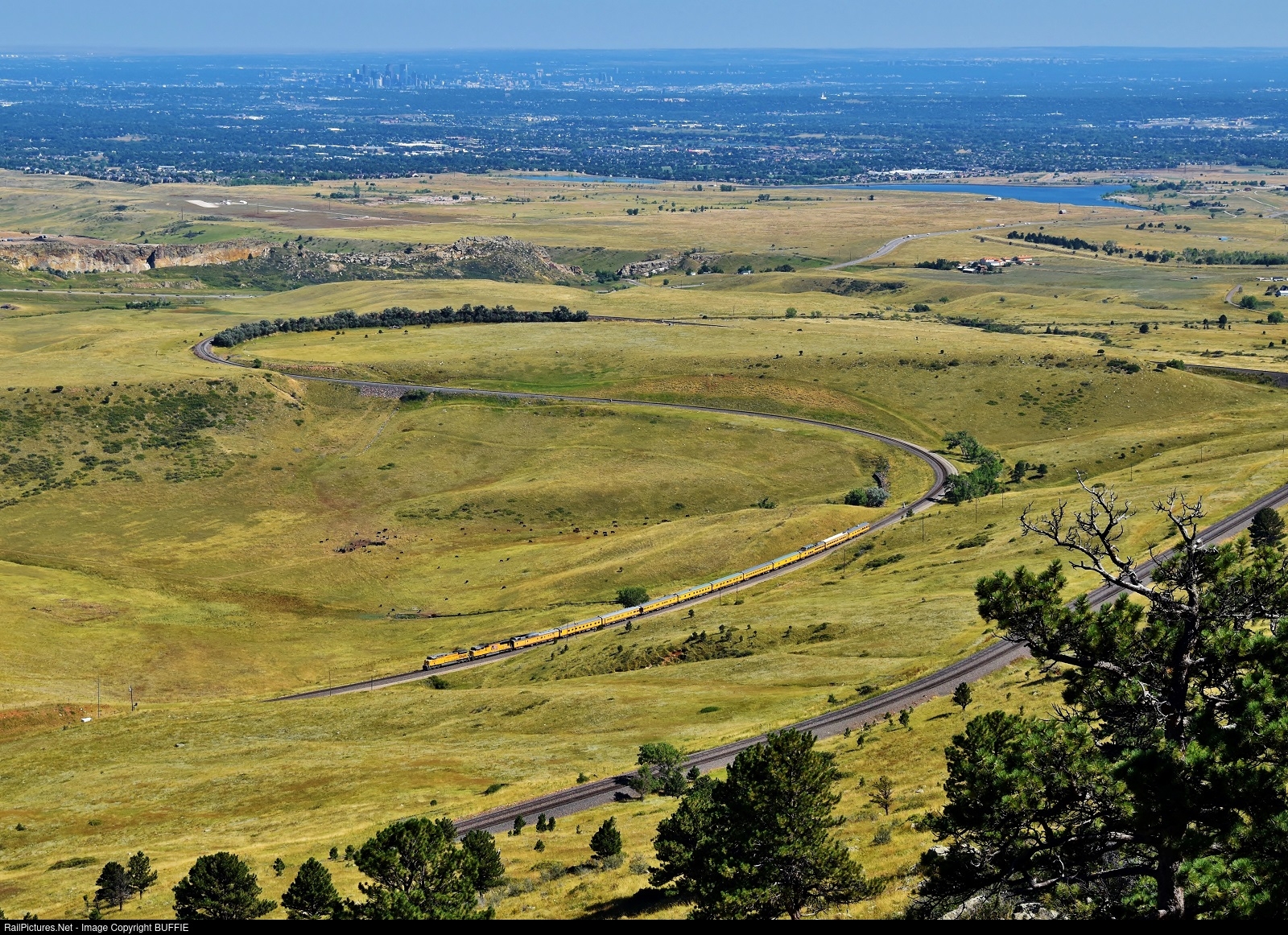 With the destination of the skyline of Denver, Colorado in the upper left, UP 6454 (AC4400CW) leads an officer's special through Big Ten Curve as comes down the Moffat Tunnel Sub.